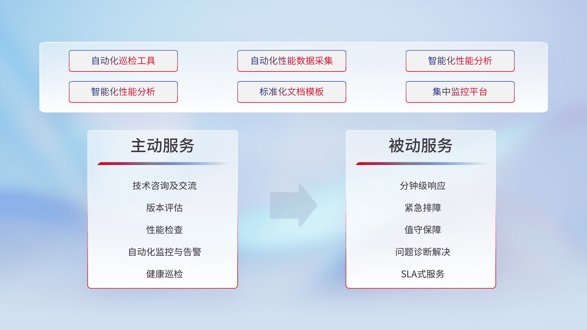 智能化工具和标准化文档,,保障服务质量,,,,提供主动服务(包含技术咨询、、、、版本评估、、、性能检查、、、自动化监控与告警、、、、健康巡检)和被动服务包含(分钟级响应、、、、紧急排障、、、值守保障、、、问题诊断解决、、、SLA服务)。。。
